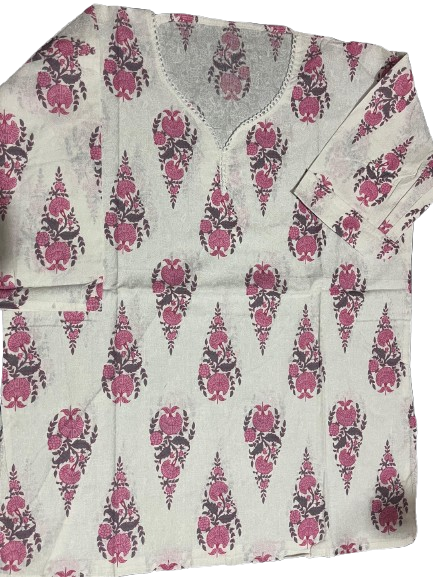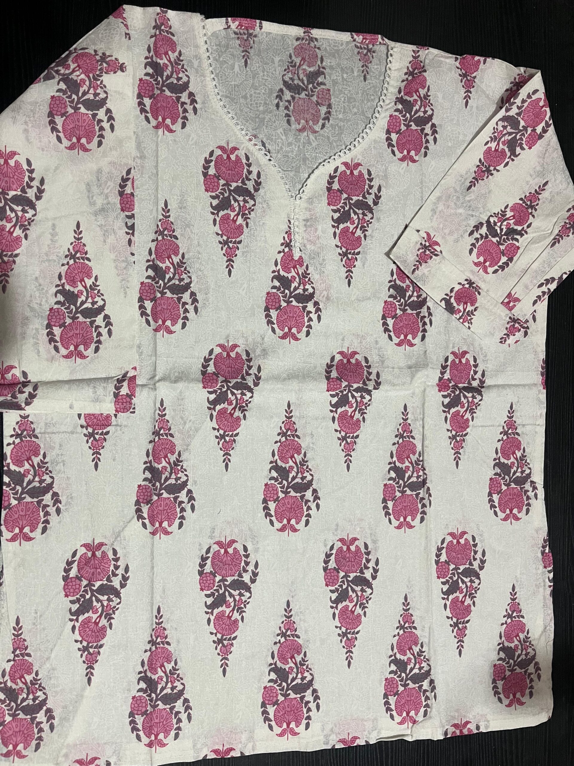 Add a refreshing touch to your ethnic wardrobe with this stylish cotton printed kurti. Featuring an all-over floral paisley print in shades of pink and maroon on a soft off-white base, this kurti is designed for both comfort and elegance. The lightweight fabric makes it perfect for daily wear, casual outings, or small festive occasions.