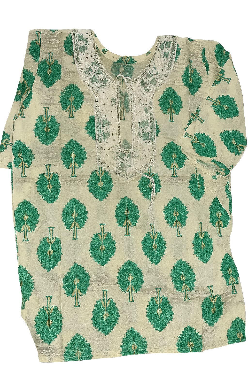 Print colour: Bright green (hara) se bade-bade tree motifs (ped ke design) bane hain.